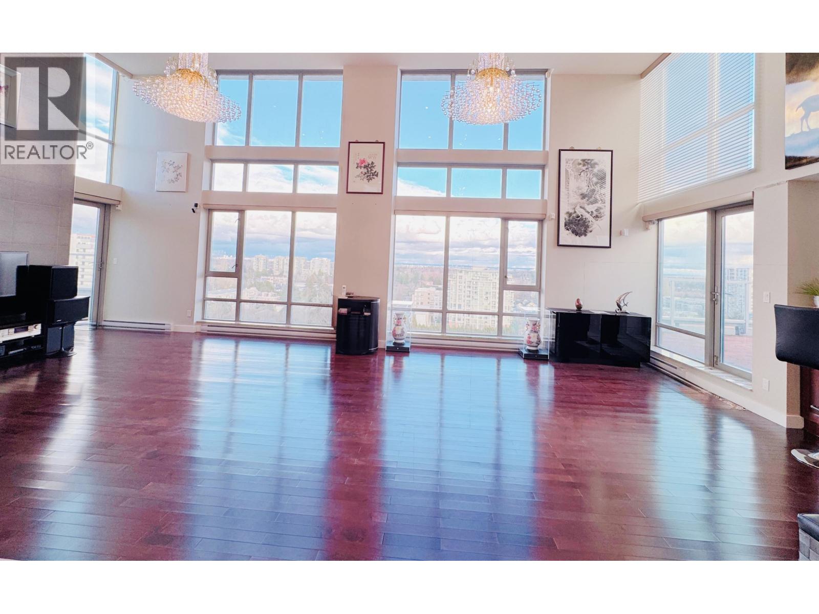 A rare luxury penthouse in the centre of Richmond Brighouse featuring 3 bedrm & a versatile study/den, TWO side-by-side parking stalls. Walk in the grand open lobby and the living dining room with a high ceiling of 16.5' and sweeping panoramic views. Expansive windows flood the space with natural light and the beautiful chandeliers add elegance. Two ensuite bedrooms plus two additional large patios. In-suite Sauna, wine cooler, extra large walk-in-closet, Western kitchen and wok kitchen, double-door fridge, Miele appliances, double kitchen sink and vanity. Enjoy shopping, restaurants in the neighbourhood, close to YVR! Minutes of walk to Richmond Brighouse Station. Central location, panoramic beauty, elegant living! (id:9345)...