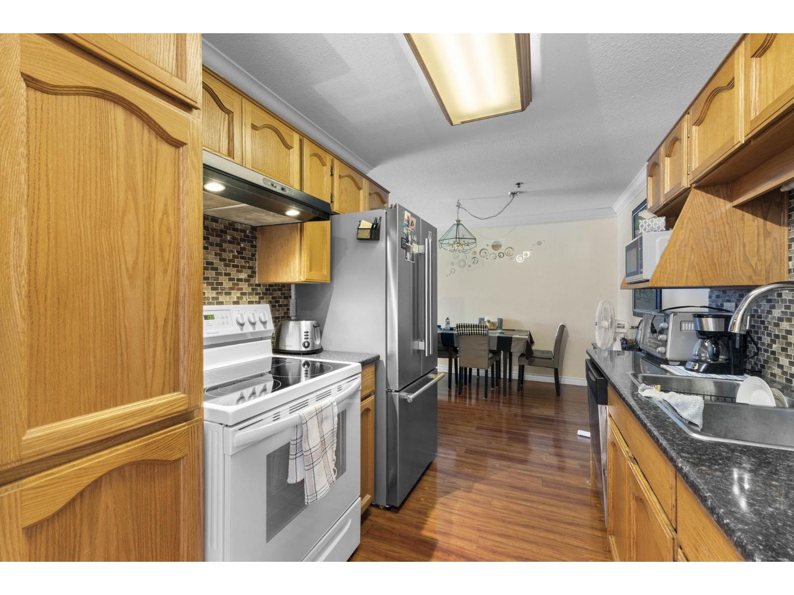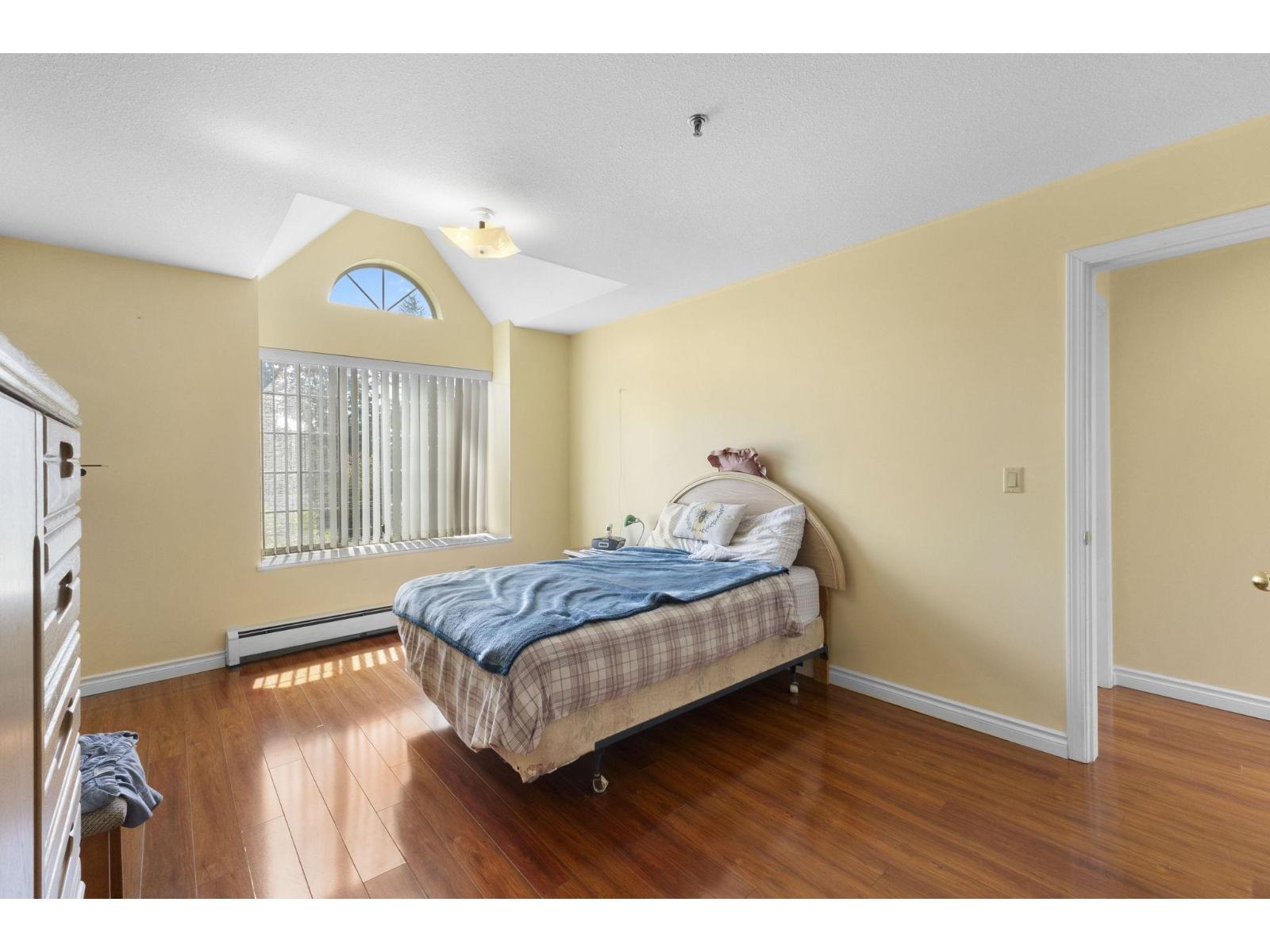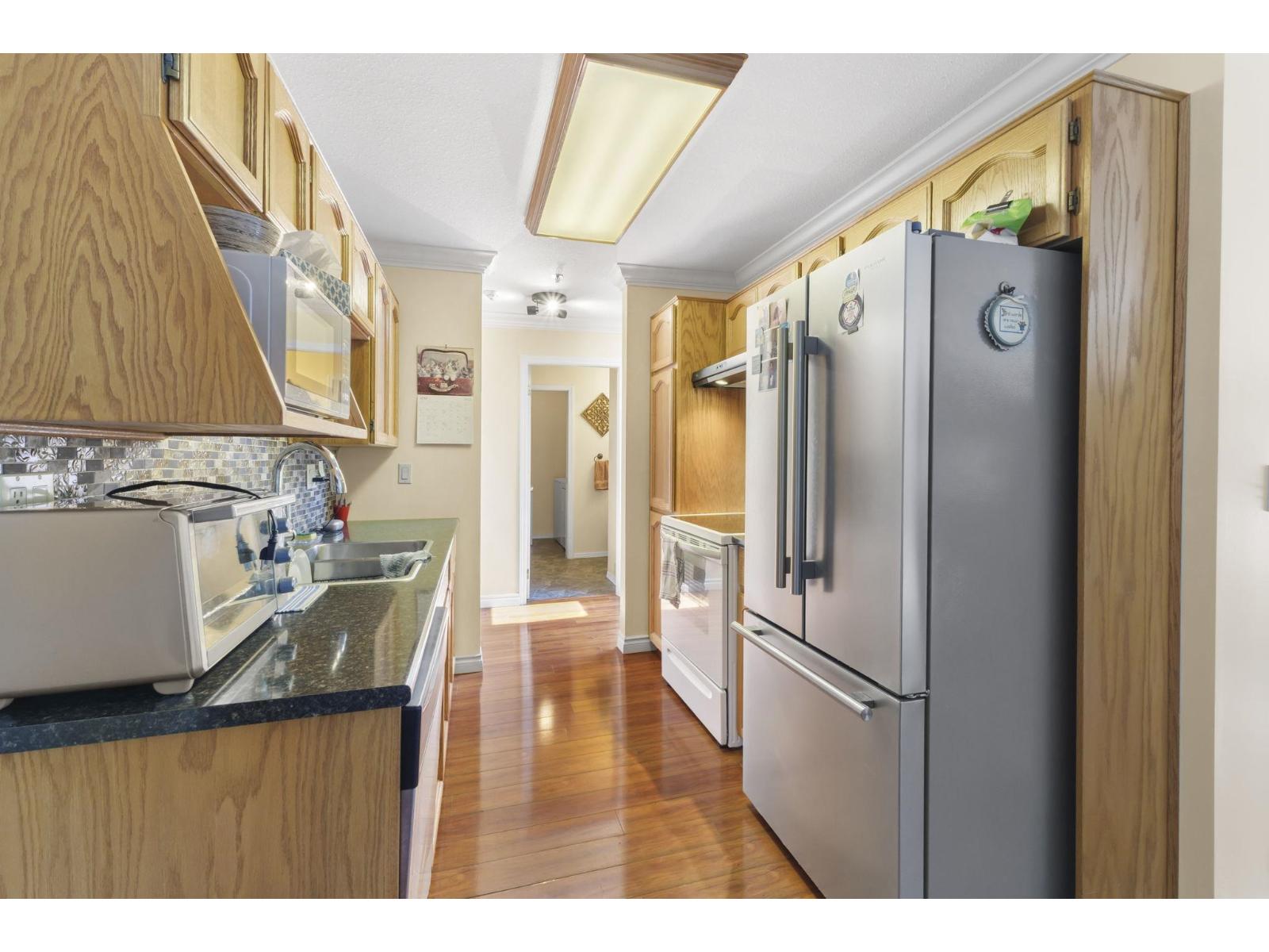 Top-floor charm in Central Heights Manor! This bright 2 bed, 2 bath condo welcomes you with a skylit foyer and stylish laminate floors throughout. Enjoy formal living and dining spaces with elegant crown moulding, rich draperies, and a cozy wall-mounted electric fireplace. Step into the sunny south-facing deck through sliding glass doors. The galley kitchen features sleek stainless steel appliances. Relax in the spacious primary bedroom with vaulted ceilings, walk-in closet, and 4-piece ensuite. The second bedroom is ideal as a guest room, office, or den. In-suite laundry with extra storage, 2 storage lockers, and a secure underground parking stall, and great amenities that include a gym, games room, workshop, art room, coffee area, guest suites, BBQ pit, and a community piano! (id:9345)...